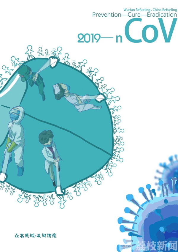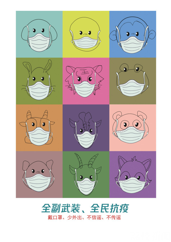 2019级工业设计专业的马微在家乡四川遂宁做抗“疫”志愿者,看到志愿者中的医生、退伍军人,还有很多普通人在为疫情防控共同努力,于是创作了作品《众志成城 共同抗疫》,马微说:“有人在前方抗战,有人在后方努力,这才是全民抗‘疫’。”