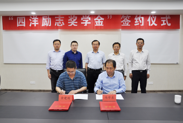 仪式上,对外合作处处长佘建国代表学校教育发展基金会与冯学东总经理签订“四洋励志奖学金”协议书。周南平校长代表学校向冯学东总经理颁发捐赠证书。