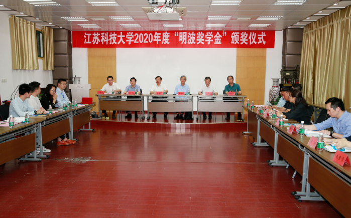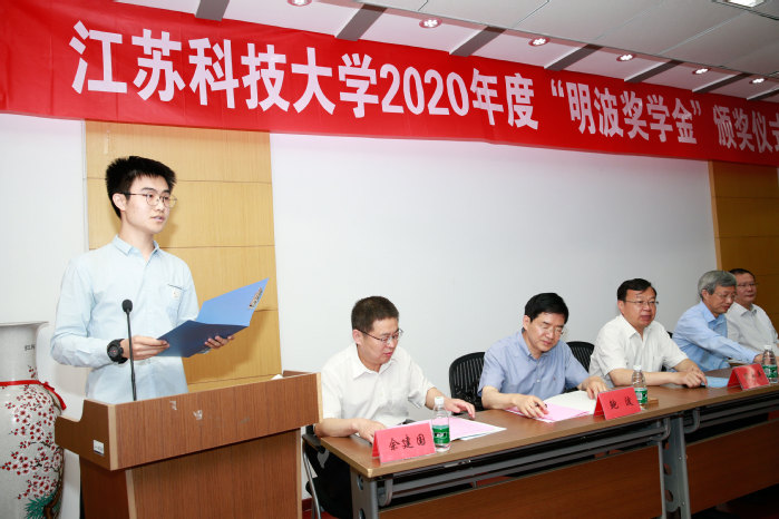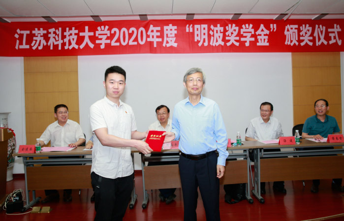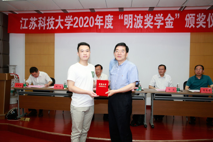周南平校长向“明波奖学金”发起校友颁发《捐赠证书》;学生处处长蒋春雷宣读《关于表彰2020年“明波奖学金”获奖者的决定》;两位嘉宾校友为获奖学生代表颁发证书。获奖学生代表张一驰表示,在未来工作岗位上一定会用过硬的专业知识和技能,为母校增光添彩,实现自己的造船梦。