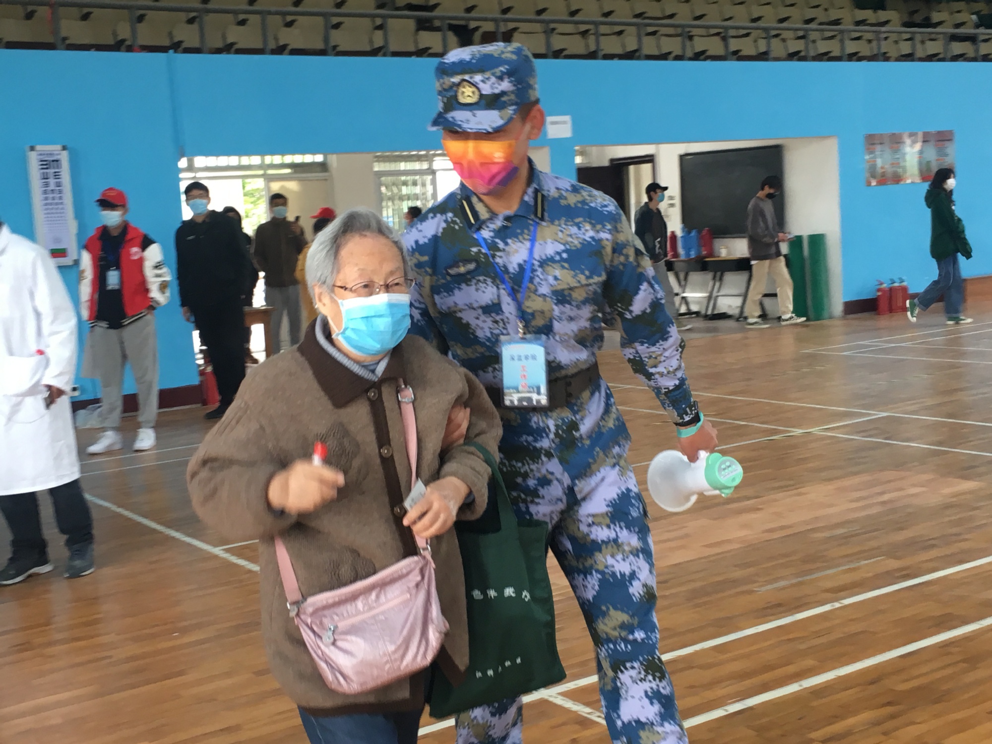 4月17日,最先被老师同学“曝光”的是严凌。这名帅小伙2019年9月入伍,曾任中国人民解放军某部副班长,目前是学校深蓝学院2021级电气工程及其自动化专业学生。“看到行动不便的老奶奶,本能地去扶了一把,没想到有人把我这一举动拍了下来,还发到朋友圈。”在核酸检测现场,严凌多次遇到那位81岁高龄的退休老教师。因为老人腿脚不便,严凌就干脆一路搀扶着她,陪同排队并且完成核酸采集。“老奶奶跟我奶奶一样都姓管,非常亲切,还会主动关心我的学习,问我志愿服务累不累,还给我讲诉了很多学校故事,是江科大发展历程的参与者和见证者。当我站立执勤很累的时候,想起老前辈就深感力量倍增”。