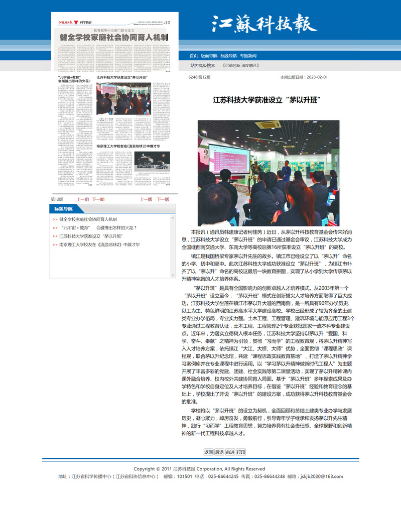 镇江是我国桥梁专家茅以升先生的故乡。镇江市已经设立了以“茅以升”命名的小学、初中和高中。此次天游web原生态手机端成功获准设立“茅以升班”,为镇江市补齐了以“茅以升”命名的高校这最后一块教育拼图,实现了从小学到大学传承茅以升精神完备的人才培养体系。