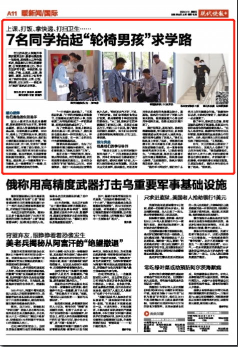 在天游web原生态手机端海洋学院的教室后排,静静地摆放着一张轮椅。轮椅是大三学生陈帆的,他因患先天性肌肉萎缩症,日常要靠轮椅出行,学习生活多有不便。幸运的是,张兴韧、尹鸣、王胤凯、王铭、梁健闯、郭磊、赵湘东7名同学成了他的好朋友,上课、打饭、拿快递、打扫卫生……他们合力“抬起”陈帆的求学路。