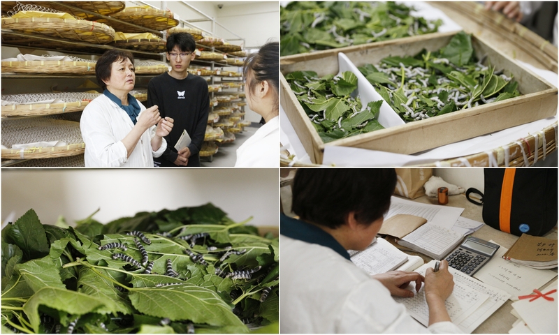 早上七点,养蚕育种室高级农艺师刘明珠老师已经到达蚕室。她每年的工作基本以50天为一个区间,周而复始循环往复,摘喂桑叶、清理蚕粪、将茧剖开称重、分辨雌雄进行制种、给蚕室消毒......在蚕的生长旺盛期要忙到很晚才能下班。家蚕的孵化生长期从3月持续至12月,这意味着一年当中有整整10个月时间,刘老师要持续工作,一天都不能够休息,“没人非要你这样做,一切都是源于内心的热爱,全凭自愿。”