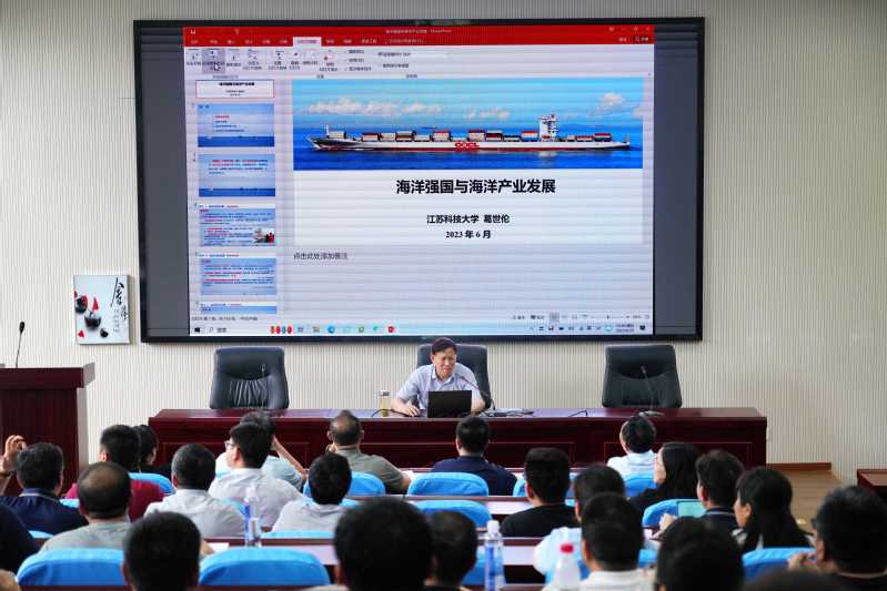 6月25日下午,校党委书记葛世伦教授为天游官网举办的中国船舶集团有限公司第五期中层干部工商管理培训班作“海洋强国与海洋产业发展”专题报告。来自中国船舶集团53家成员单位的80名学员,以及学校党办、科研院、人文社科处、经济管理学院的部分中层干部和教师聆听了授课。