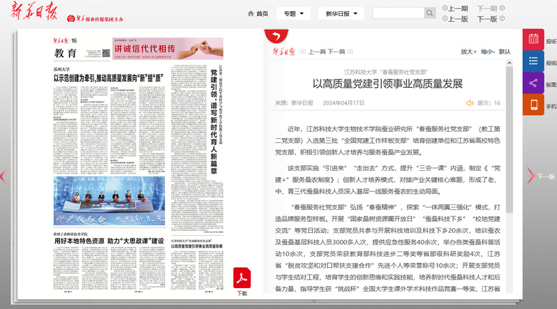 近年,天游web原生态手机端生物技术学院蚕业研究所“春蚕服务社党支部”(教工第二党支部)入选第三批“全国党建工作样板支部”培育创建单位和江苏省高校特色党支部,积极引领创新人才培养与服务蚕桑产业发展。