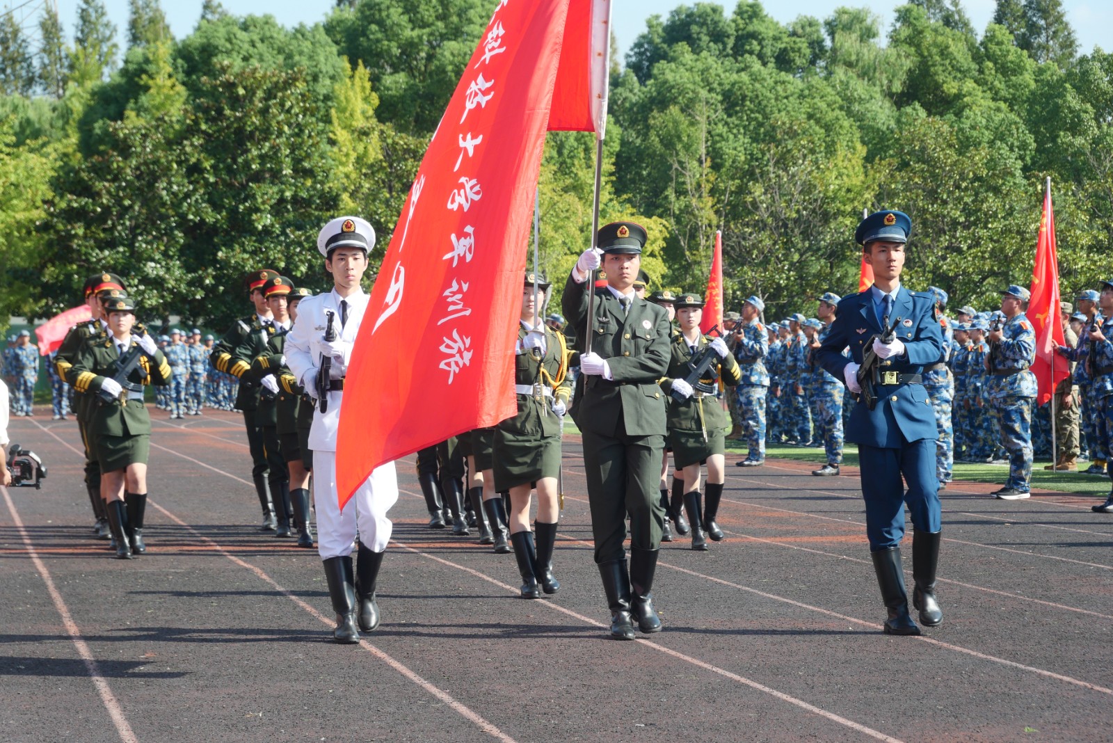 在嘹亮的军歌声中,参训新生进行了分列式、军体拳、擒拿拳、匕首操、刺杀操、战术协同等科目的表演。