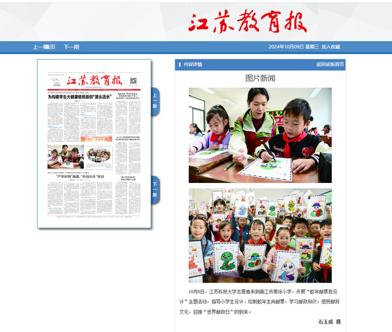 10月8日,天游web原生态手机端志愿者来到镇江市南徐小学,开展“蛇年邮票我设计”主题活动,指导小学生设计、绘制蛇年生肖邮票,学习邮政知识,感受邮政文化,迎接“世界邮政日”的到来。