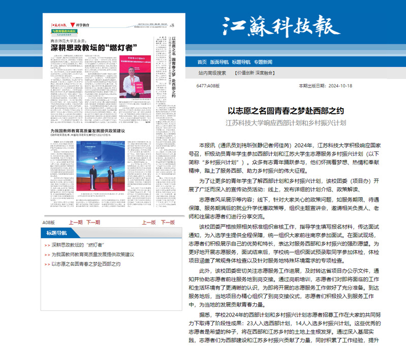 据悉,学校2024年的西部计划和乡村振兴计划志愿者招募工作在大家的共同努力下取得了阶段性成果:23人入选西部计划,14人入选乡村振兴计划。这些优秀的志愿者是希望的种子,将在西部和江苏乡村的土地上生根发芽。通过深入基层实践,志愿者们为西部建设和江苏乡村振兴贡献了力量,同时积累了工作经验,提升了工作能力,为未来个人就业发展奠定了坚实基础。