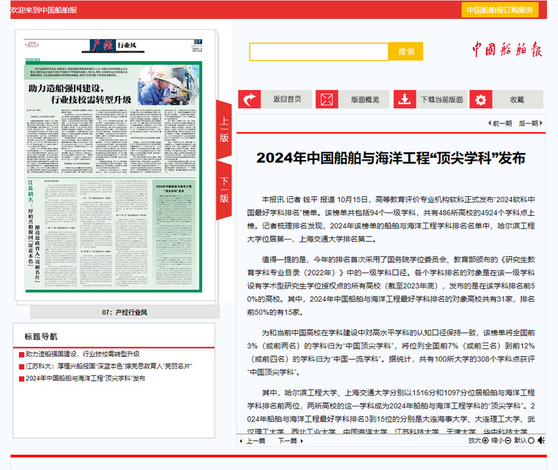 本报讯 记者 钱平 报道 10月15日,高等教育评价专业机构软科正式发布“2024软科中国最好学科排名”榜单。该榜单共包括94个一级学科,共有486所高校的4924个学科点上榜。记者梳理排名发现,2024年该榜单的船舶与海洋工程学科排名名单中,哈尔滨工程大学位居第一,上海交通大学排名第二。
