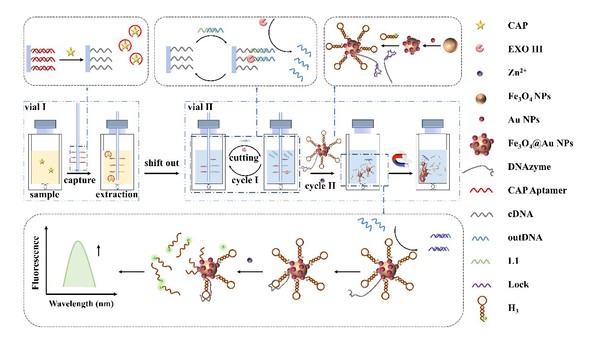 在农林畜牧产业中广泛使用的各类抗生素已成为食品污染的主要来源之一,尤其是其微量残留的生物富集效应对人体的威胁更加隐蔽。因此精准便捷地分析复杂食品样品中痕量抗生素残留显得尤为重要。研究者所在团队采用独创的石英棒核酸修饰技术构建固相微萃取体系,并结合DNA纳米步行机探针,通过双重放大策略实现了氯霉素的超灵敏检测。此外,通过活体动物给药实验,探究了微量氯霉素在生物体内的蓄积现象。