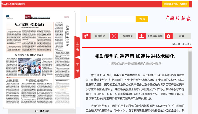 大会分别发布《中国船舶行业专利高质量发展指数报告(2024年)》《中国船舶工业知识产权发展报告(2024)》。在专利高质量发展指数排名前20位的企业中,新进的企业为中国船舶集团有限公司旗下第七〇三研究所和武汉船舶通信研究所、招商局金陵船舶(南京)有限公司、招商局重工(深圳)有限公司、友联船厂(蛇口)有限公司、航宇救生装备有限公司等6家企业。此外,中国船舶集团旗下武汉第二船舶设计研究所、中船黄埔文冲船舶有限公司排名较去年显著提升。同时,知识产权发展报告从中国船舶工业专利发展概况、中国船舶工业重要申请人分析、中国船舶工业专利运营分析、船舶行业专利高质量发展指数排名、专利奖获奖概况、行业热点方向专利技术专题分析等6个维度,阐述了中国船舶工业企业在知识产权领域的发展现状。