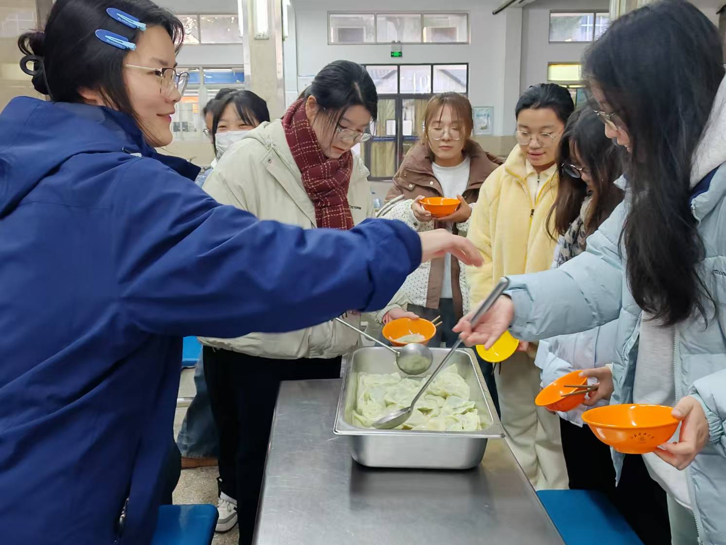 冬至共团聚,饺子传温情。12月21日,冬至来临,人文社科学院在梦溪校区学生食堂内举办包饺子活动,弘扬传统文化的同时,也增进了同学们之间的交流,体验不一样的节日氛围。同学们欢聚一堂,共同学习包饺子技巧,体验传统文化的魅力。在轻松愉快的氛围中,不仅锻炼了动手实践能力和创造能力,更增进了彼此之间的友谊,参与者制作的饺子形状各异,有的模仿小笼包,有的则呈现出扁平的形态,体现了大家的创意和用心。当一盘盘热气腾腾的饺子端上桌时,大家迫不及待地品尝自己的劳动成果。同学们将亲手包的饺子分给活动现场的师生,将这份冬至温情传递。