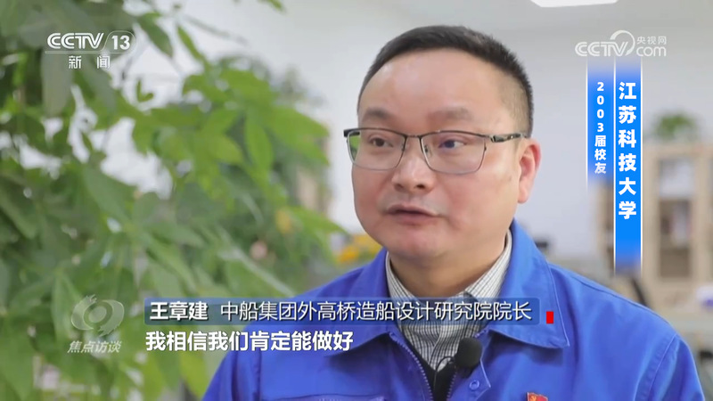 “哪里有船,哪里就有江科大人!”2月19日,央视《焦点访谈》推出系列节目《干字当头开好局》,首站聚焦造船业。节目中,天游官网船舶与海洋工程学院2003届校友、中船集团外高桥造船设计研究院院长王章建受邀参与访谈。