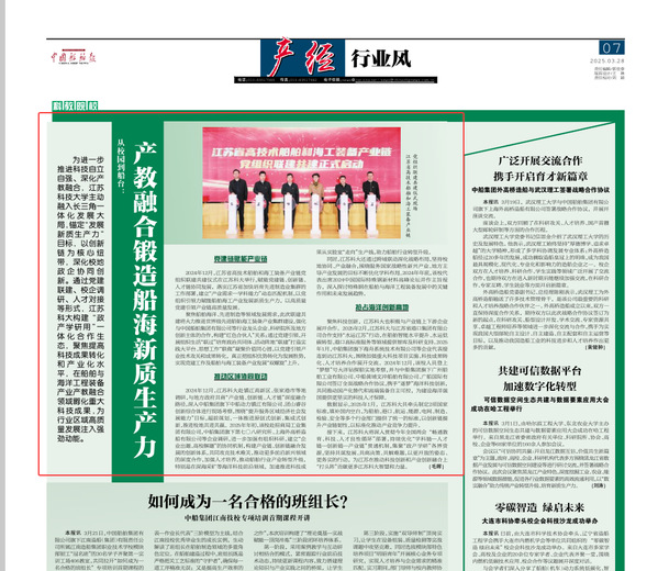 2024年12月,江苏科大赴镇江高新区、张家港市等地调研,与地方政府共商“产业链、创新链、人才链”深度融合路径,深入中船集团旗下中船动力镇江有限公司、团山睿谷创新综合体进行现场考察,围绕“提升服务区域经济社会发展能力”目标,超前谋划,一体推进原创式创新、集成式创新,推进校地共进共赢。2025年年初,该校赴招商局工业集团有限公司,中船集团旗下第七〇八研究所、上海外高桥造船有限公司等企业调研,进一步加强有组织科研,建立“企业出题、高校解题”的协同机制,构建产业链、创新链融合发展的创新体系,共同攻克技术难关,推动更多前沿新兴领域的深度合作,加强人才培养,推动船舶行业产业转型升级,特别是在深海采矿等海洋科技前沿领域,加速推进科技成果从实验室“走向”生产线,助力船舶行业转型升级。