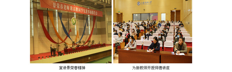 学校组建由景荣春同事宋向荣、学生王清曌和教师代表王逊组成的报告团,面向高校和社会从不同角度、不同侧面生动地介绍景荣春同志爱岗敬业、关爱学生,刻苦钻研、严谨笃学,勇于创新、奋发进取,淡泊名利、志存高远的感人事迹。