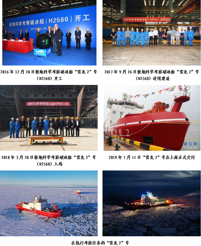 “雪龙2”号是中国第一艘自主建造的极地科学考察破冰船,也是全球第一艘使用船艏、船艉双向破冰技术的极地科考破冰船,填补了我国在极地科考重大装备领域的空白。“雪龙2”号船长122.5米,宽22.32米,设计排水量13996吨,可以以2-3节的航速,在冰厚1.5米的条件下,连续破冰航行,续航力为2万海里,具备全球航行能力,能满足无限航区要求。2019年10月15日,“雪龙2”号与“雪龙”号一起“双龙探极”,开启了中国极地考察新格局。2023年9月5日,“雪龙2”号平稳而有力地抵达北极点,这是中国船舶首次抵达北极点……2025年4月12日,“雪龙2”号圆满完成了我国首次南大洋秋季科考任务。