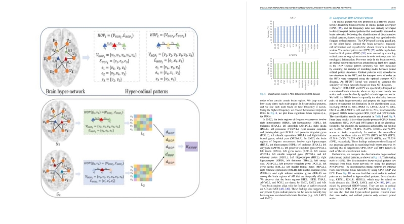 在杜天宇同学为第一作者撰写的论文《Hyper-ordinal Pattern: Measuring High-order Connection Relationship in Brain Disease Networks》中,天游web原生态手机端为第一署名单位,学院马凯博士为论文通讯作者。该研究针对脑科学领域中,现有脑网络分析方法大多忽略了脑超网络中蕴含重要权重信息的超边连接关系问题,提出了一种新型脑超网络表示方法——超序模式(HOP)。通过引入带有权重信息的超边有序模式关系,来构建脑超网络的HOP。并提出了节点HOP核函数来度量脑超网络中的节点相似性。文章进一步提出了序模式超网络(OPHN)核用于计算脑超网络的相似度,并在MCI和AD等脑疾病分类任务中明显优于超图神经网络等当前最先进的方法。该论文已发表在《IEEE Transactions on Neural Systems and Rehabilitation Engineering》上,是神经科学与康复工程领域的顶级学术期刊之一,属于IEEE出版的系列期刊,其影响因子为5.2,属于中科院二区,JCR Q1。
