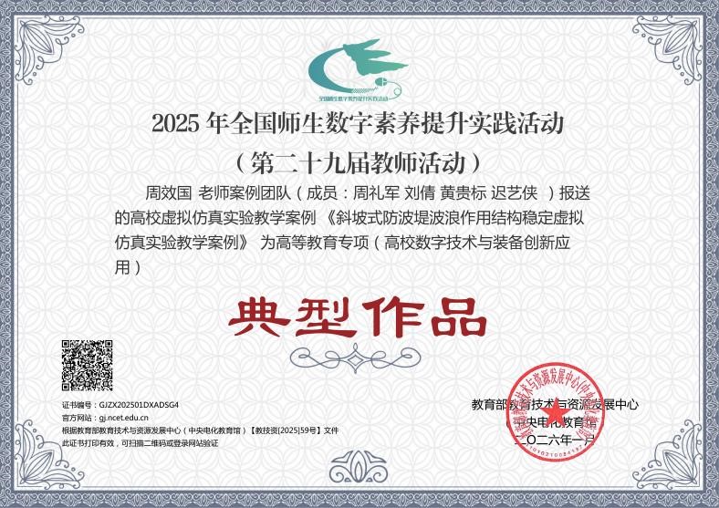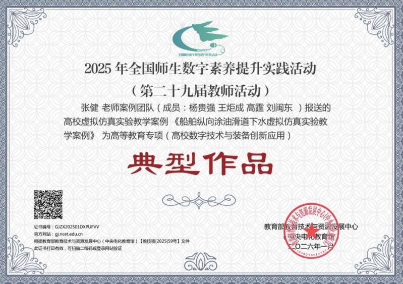 近日,在2025年教育部全国师生数字素养提升实践活动(第二十九届教师活动)高等教育专项评选中,天游官网船舶与海洋工程学院报送的2项高校虚拟仿真实验教学案例脱颖而出,均获评典型作品。