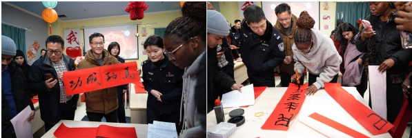 在书法体验区,丹徒区司法局的老师铺开红纸,挥毫示范,带领留学生们领略中国传统书法文化之美,用毛笔抒发对新年的美好期盼。